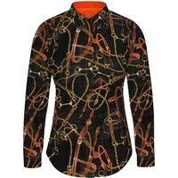 Harness equestrian elegance with the "Snaffle" print shirt. Perfect for both horse lovers and fashion enthusiasts, this design features intricate snaffle bits set against a rich backdrop. Crafted from a luxurious satin-cotton blend, it offers a sophisticated look that's ideal for countryside outings or a day at the races. Pair it with tailored trousers and riding boots for a polished equestrian ensemble, or wear it with jeans for a more casual yet refined look. This shirt is your perfect companion fo...