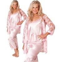 Lightweight Satin Comfort: Smooth, breathable polyester satin keeps you cool and comfortable on warm summer nights. Vibrant Colour Options: Choose from aqua, black, cream, lilac, pink, or red to suit your summer style. Easy Care: Machine washable for everyday convenienceperfect for busy lifestyles. Three-Piece Versatility: Includes camisole, flowing pyjama bottoms, and an elegant lace jacketwear together or mix and match with your summer wardrobe. Elegant Lace Detailing: The lace jacket adds a chic laye...