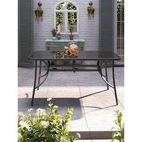 Living and Home Rectangular Garden Table with Parasol Hole L 150 cm This garden table is inspired by traditional wrought-iron furniture, bringing a romantic touch to your outdoor space. Stylish and classic black appearance, simple and chic style, this black screen-printed table will look great in any garden or terrace area. It is not only good-looking, but also has good quality and a practical top to ensure long time use. What??s more, it can be used on sunny and rainy days since there??s an umbrella ho...
