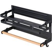 Revamp your kitchen or bathroom with a sleek Magnetic Fridge Storage Rack! Its minimalist and modern design seamlessly complements any dcor style. With its multi-layer structure, vertical storage is maximised, offering ample room for spices, toiletries, or kitchen essentials. Side hooks and a wooden towel rack enhance its versatility, making it easy to hang towels, tissue rolls, or utensils within reach. It attaches effortlessly to any magnetic surface, requiring no tools and leaving no damage to your walls. | Living and Home No Punching Magnetic Metal Fridge Storage Rack Kitchen Organiser in Black - Manufacturers part number: Living and Home_0000810423242