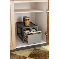 Built for stability, crafted for everyday use. Made from heavy-duty carbon steel, this storage organiser offers superior load-bearing strength and long-lasting durability. Its corrosion- and oil-resistant finish ensures resilience in damp or greasy conditions. A smooth-gliding pull-out tier maximises storage, keeping bottles, cleaners, and essentials neatly organised and within easy reach. The upper shelf supports pots, pans, and larger items, delivering a balanced solution for compact areas. Raised side rails prevent items from falling, adding peace of mind. Perfectly sized for under-sink spaces, cabinets, or bathroom corners, it brings lasting order to crowded areas. | Living and Home 2-tier Kitchen Pull-Out Storage Drawer Basket Organiser Spice Rack in Dark Grey - Manufacturers part number: Living and Home_0000810423327