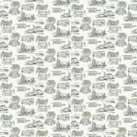 An etching style drawing of a 60s American camping scene with little vignettes with figures, buildings, campsites and mountain views. Shown here in the Green colourway. Spray and hang product. Wide width and shorter than standard roll length. - Manufacturers part number: York_RT7863