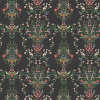 Drawing inspiration from French palace gardens, this design features mirrored medallions of florals, greenery, and the occasional bird to create a trailing pattern that is sophisticated and timeless. Shown here in the Black Multi colourway, with small metallic gold details. Wide-width design. - Manufacturers part number: Rifle Paper Co._RP7329