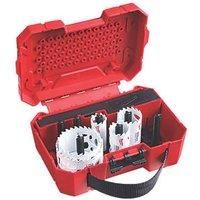 Kit containing holesaws with carbide teeth features 3Tpi aggressive tooth geometry with large gullets for improved material removal, offset for less resistance. PLUG JACK slot geometry provides deep access to remove thick plugs and high leverage for thin materials. Provides excellent life, high heat and wear-resistance compared to bi-metal holesaws. Cuts Wood & Metal Steel Continuous Angled Slotted Barrel Provides Leverage for Easy Plug Ejection and Removal 22mm - 64mm Dia. Holesaws Can be Used with Rot... - Manufacturers part number: 226GE