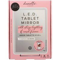 Achieve flawless makeup with the Danielle Creations LED Tablet Mirror. This stylish mirror features bright LED strip lighting that illuminates your face evenly, making it perfect for your dressing table or vanity. The distortion-free glass provides a true reflection, while the metal easel frame includes a convenient smartphone holder for multitasking or recording your beauty routine. The touch-screen light switch allows you to easily turn the LED lights on and off, as well as adjust the brightness to your preference. It can be powered by 4 AA batteries (not included) or the supplied USB cable, offering flexibility for use anywhere. | Danielle Creations LED Tablet Mirror Strip Lighting & Easel Frame in Silver - Manufacturers part numbers: D1049|Danielle Creations_064323298087