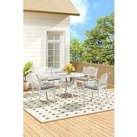 Enjoy your outdoor times with family and friends with the Livingandhome garden furniture set. The table features exquisite detailing with a rounded braid centre and an expanding spiral lattice. The beautiful patterns make the bistro set an elegant addition to your outdoor space. Made from cast aluminum for long-term use. Each chair comes with a separate seat cushion that is thickly padded to keep you comfortable. The table features an umbrella hole, so you can all keep shaded from a parasol safely when it's sunny. | Living and Home Set of 5 Retro Garden Bistro Set Cast Aluminum with Cushions in Beige - Manufacturers part number: Living and Home_0073553115934