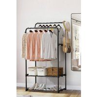 No more frantic searches for the perfect outfit simply step in front of the mirror and select your ensemble with this clothes rack. Equipped with two high and low hanging rods and two spacious shelves, this clothes rack offers ample storage space. Hang your suits, dresses, and shirts on the rods, and utilize the shelves for shoes, handbags, and even folded clothing. For those living in apartments or compact homes, this clothes rack is designed to maximize storage in even the tightest corners. | Living and Home 2 Rod Metal Clothes Rack Garment Rack Holder with 2-tier Shelves Indoor Bedroom in Black - Manufacturers part number: Living and Home_0073553118638