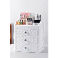 Place this storage box on your dressing table to tuck away your cosmetics, jewellery, and other small items. Featuring rhombus fronts accented with diamond-like handles, this makeup organizer contributes to its delicate appearance, making it not only a functional storage solution but also a beautiful decor piece. The top tray is divided into sections, keeping your beauty products on display and ensuring everything has its place. | SHEONLY White Plastic Makeup Organizer With 3 Drawers Cosmetic Storage Box - Manufacturers part number: SHEONLY_0073768299078