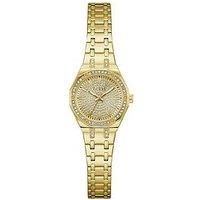 GUESS gold tone Ladies watch with glitz dial and gold tone bracelet GUESS gold tone Ladies watch with glitz dial and gold tone bracelet 24Hr Display: N Depth: 7.95 MM Height: 25 MM Width: 25 MM Case Diameter (in cm): 2.5 Case height (in cm): 2.5 Case Length (in cm): 2.5 Case Shape: Round Case Width (in cm): 2.5 Movement: Japanese Quartz (battery) Strap Material: Stainless Steel Water Resistant: Y - Manufacturers part number: GW0931L2