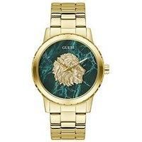 Guess GUESS gold tone green dial with lion head and gold tone bracelet GUESS gold tone green dial with lion head and gold tone bracelet 24Hr Display: N Depth: 11.1 MM Height: 44 MM Width: 44 MM Case Diameter (in cm): 4.4 Case height (in cm): 4.4 Case Length (in cm): 4.4 Case Shape: Round Case Width (in cm): 4.4 Movement: Japanese Quartz (battery) Strap Material: Stainless Steel Water Resistant: Y - Manufacturers part number: GW0958G2