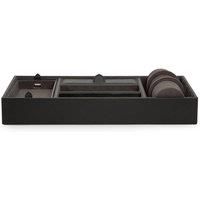 Stylish and classic, Blake is brought to life with top grain leathers, chrome and bold accents. This sleek leather valet tray effortlessly organizes your electronics, money, jewelry, keys, watches and more. Includes ultrasuede lining, 5 storage compartments, and a watch cuff that is interchangeable with the Blake Watch Roll, making it easier to travel with your timepieces.