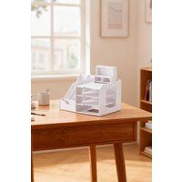 This desk organiser helps keep your desk tidy and boosts productivity. Featuring a sleek design in pure white, it effortlessly blends into various spaces such as offices or study rooms. The main body includes four open-tier shelves, perfect for categorising files, notebooks, and other office supplies to keep your desk clutter-free. Two side storage compartments allow you to store A4 documents, folders, or even your phone upright for quick and easy access. Additionally, the top section integrates a small pen holder and small stationery compartments, providing convenient storage for pens, scissors, sticky notes, and other essentialskeeping everything within reach. | Living and Home White Desktop Letter Tray Organiser with Pen Holder for Office & Home - Manufacturers part number: Living and Home_0099641351107