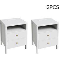 Meet the ultimate bedside companion: storage and seamless charging perfectly combined for smart living! This beside table offers two deep drawers for stashing away essentials like books and chargers, plus an open shelf for easy access. The spacious top is perfect for lamps or dcor. Its standout feature is the integrated charging stationtwo outlets, one USB-A, and one USB-C port for fast device charging. Keep your phone, tablet, and gadgets powered up right where you need them. It is a functional and tidy upgrade for any bedroom or small space! | Living and Home Set of 2 Bedside Tables with Charging Station & Drawers in White - Manufacturers part number: Living and Home_0099641430284