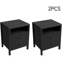 Meet the ultimate bedside companion: storage and seamless charging perfectly combined for smart living! This beside table offers two deep drawers for stashing away essentials like books and chargers, plus an open shelf for easy access. The spacious top is perfect for lamps or dcor. Its standout feature is the integrated charging stationtwo outlets, one USB-A, and one USB-C port for fast device charging. Keep your phone, tablet, and gadgets powered up right where you need them. It is a functional and tidy upgrade for any bedroom or small space! | Living and Home Set of 2 Bedside Tables with Charging Station & Drawers in Black - Manufacturers part number: Living and Home_0099641430291
