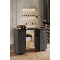 This manicure table is designed for efficiency-focused nail technicians. It features a sleek solid-colour finish that exudes premium style and seamlessly fits into any salon setting. Its spacious tabletop offers ample room for nail lamps, tool trays, and more. Multiple drawers and a cabinet with an adjustable shelf provide organised storage for all your nail supplies, keeping your workspace tidy. Drawers and a cabinet door are fitted with sleek bar handles for easy opening and closing. Plus, integrated casters allow effortless mobility, making it easy to reposition as needed. | SHEONLY Mobile Manicure Table with 1 Cabinet & 4 Drawers in Black - Manufacturers part number: SHEONLY_0099641433025