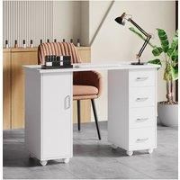 This manicure table is designed for efficiency-focused nail technicians. It features a sleek solid-colour finish that exudes premium style and seamlessly fits into any salon setting. Its spacious tabletop offers ample room for nail lamps, tool trays, and more. Multiple drawers and a cabinet with an adjustable shelf provide organised storage for all your nail supplies, keeping your workspace tidy. Drawers and a cabinet door are fitted with sleek bar handles for easy opening and closing. Plus, integrated casters allow effortless mobility, making it easy to reposition as needed. | SHEONLY Mobile Manicure Table with 1 Cabinet & 4 Drawers in White - Manufacturers part number: SHEONLY_0099641433049