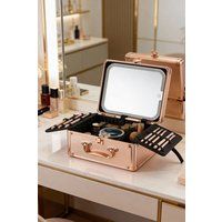 The chic portable makeup case is designed for the woman on the go! It opens up to reveal 6 removable EVA dividers and two dedicated brush boards, allowing you to tailor the layout perfectly. The real star is the built-in HD LED mirror; it is removable and comes with a sturdy stand for hands-free use. With three colour temperature control and stepless dimming, simply charge it in via USB to achieve flawless makeup in any setting. Compact, stylish, and incredibly clever, it is the ultimate organiser and handbag must-have. | SHEONLY Portable Makeup Case with LED Mirror in Rose Gold - Manufacturers part number: SHEONLY_0099641434497