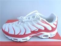 White/red uppers with Nike swoosh in red on the outer and inner sides of the shoe. Nike Air logo and swoosh on insole. Black sole with Nike TN logo and swoosh. Nike Air TN logo and swoosh on back of heel white mid sole.