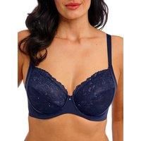 Wacoal Most Divine Classic Underwire Bra. Non padded underwired bra with stretch lace top cups, microfibre side sling for side support and sheer floral lace and mesh accents. The product is hand wash only. | Wacoal Women's Most Divine Underwire Bra in Blue | Size: 32C