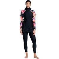 The Savannah 3 Piece Modesty Suit is designed for looking good, swimming comfortably and for limiting sun exposure. The bright and summery Savannah print is featured along the sleeves, with contrast piping placed to flatter the torso. The top is designed to be long enough to cover the whole torso while tie cords attach the top to the slim fit trousers so everything stays in place. The headpiece is removable and can be fixed via buttons to the top for security. Zoggs modesty suits also feature font-to-ba...