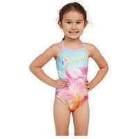 Zoggs Ecolast Queeningo Crossback- Pink The Zoggs Queeningo Crossback features a cute pink flamingo print your little one is sure to love! The thin pink straps make getting in and out of this suit a breeze. Straps are secure making this suit ideal for small swimmers! Designed in Zoggs chlorine resistant Ecolast fabric. Material Content: 82% Polyester, 18% Polyester Pbt Washing Instructions: Machine Washable Crossback design Front lined Quick drying fabric