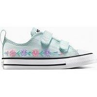 The toddler Converse All Star Lo 2V trainers have landed at schuh. Featuring a light turquoise canvas upper and cute floral detailing. These easy-on kids trainers are finsihed with two hook-and-loop straps. Classic brandign completes this pastel fit.