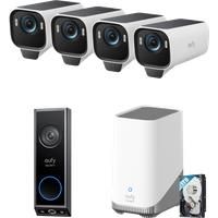 Includes: eufy eufyCam S3 Pro (4 Cam Kit), Video Doorbell E340 (Battery Powered), 1 TB hard drive. eufyCam S3 Pro 4-Cam Kit: Nighttime That's as Bright as Day; Continuous Power with Solar; Radar-Powered Detection Alerts Only What Matters; Local Security, No Monthly Fee; Compatible with Apple Home, Alexa, and Google Assistant. Video Doorbell E340 (Battery Powered): Dual Cameras, Double Security; Color Night Vision for a Clear View; See What Matters in 2K Full HD Clarity; Battery or Wired, Your Choice...