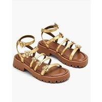 MARC JACOBS The Kiki Gladiator Sandal Size & Fit Standard fit 1.5" (40mm) heel 0.5" (15mm) pitch Available in sizes 35 - 41 (EU 35:UK 2, EU 36:UK 3, EU 37:UK 4, EU 38:UK 5, EU 39:UK 6, EU 40:UK 7, EU 41:UK 8) Details The Kiki Gladiator Sandal by MARC JACOBS Black Strappy metallic leather detailing Rubber sole Leather footbed Multi-buckle design effortlessly slides on by unbuckling the ankle strap Low block heel Material & Care Material Content: 100% COW LEATHER - Manufacturers part number: WLWR4