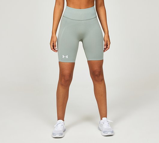 Under Armour Womens Train Seamless Shorts in Grove Green and White. A versatile pair of shorts made from soft, seamless fabric. They feature a relaxed fit for comfort and mobility, and a built-in brief for support and coverage. finished with Under Armour branding to the waistband, a relaxed fit for comfort and unrestricted mobility provide all-day comfort. Green Size - S
