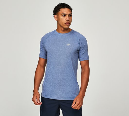 New Balance Knit T-Shirt in Heron Blue. Made from mainly recycled polyester knit fabric so you can both look and feel good about yourself at the same time whilst considering the environment. Short-sleeved and equipped with NB ICEx fast-drying technology that helps you stay cool and dry whilst your session heats up. Rib crew neck collar and printed New Balance logo to left chest for sporty style. Standard fit has a true to size feel, designed to fit away from the body. Blue Size - XL
