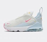 Nike Nursery Air Max 270 Trainers in White, Pinksicle, Blue Tint and Light Armory Blue. Boasting a whopping 270 degrees of comfortable soft AIR cushioning, these everyday shoes also provide a structured fit for growing feet and a lightweight, flexible breathable build. White Size - 4.5