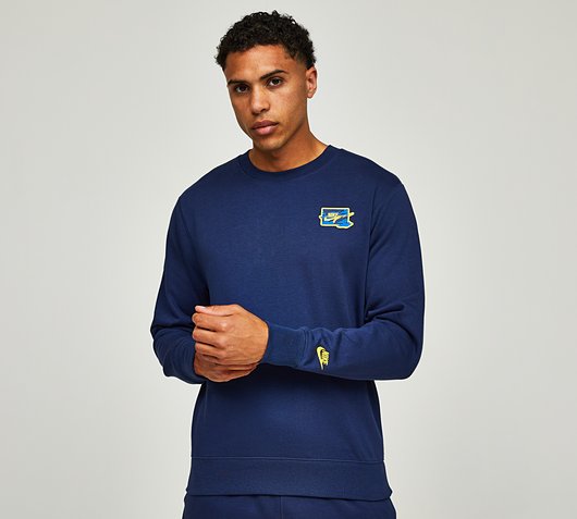 Nike Club Bolt Sweatshirt in Midnight and Lightning. Never a brand to have their head stuck in the cloudsuntil now, that is! Infiltrating your casual layering collection as quick as a flash, this overhead-style sweat comes equipped with a rib crew neck collar, cuffs and hem for a snug versatile feel. Nike branding to left chest and left sleeve, finished off with a large spectacular contrast lightning bolt graphic to reverse. Regular fit. Navy Size - S