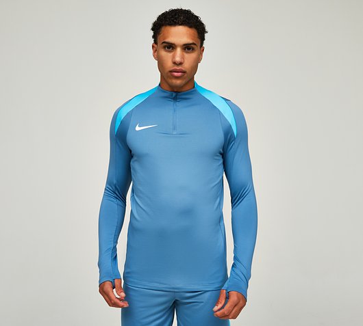 Nike Dri-FIT Strike 23 Drill T-Shirt in Aegean Storm and Baltic Blue. Slim, smooth and sweat-wicking the new iteration of the Strike Top is ready for your hardest training workouts. Constructed from Dri-FIT technology that moves sweat away from your skin for quicker evaporation, breathable knit paneling helps you stay comfortable. Perfect for wear on it's own or as a mid-layer, swoosh branding to chest, a zipped neck and added thumb holes to help keep the chill away and your sleeves in place. Blue Size...
