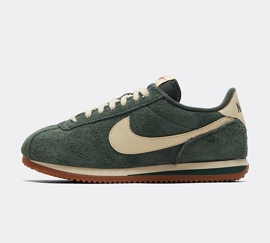 Nike Womens Cortez Trainers in Vintage Green, Muslin and Gum. Based on consumer feedback, the already impressive Cortez has been revamped whilst also maintaining its distinct retro charm. Now showcasing a wider toe area and firmer side panels for perfect all-day, everyday wear. Made from lush textured suede for a real heritage feel, secure lace fastening, padded collar, foam midsole with iconic wedge insert that provides lightweight cushioning and herringbone outsole pattern for durable traction. The Ni...