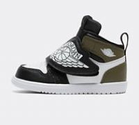 Nursery Sky Jordan 1 Trainers in Black, White and Medium Olive. The mini version of the Air Jordan 1 minus the Air cushioning. Soft foam cushioning, signature Wings logo adorns the oversized hook and loop mid-foot strap for a secure fit, perforated toe box, famous Jordan Jumpman logo, cushioned ankle collar and grippy rubber outsole for enhanced traction. Crafted from a mix of real and synthetic leather materials that really give this shoe that classic look and feel. Black Size - 5.5
