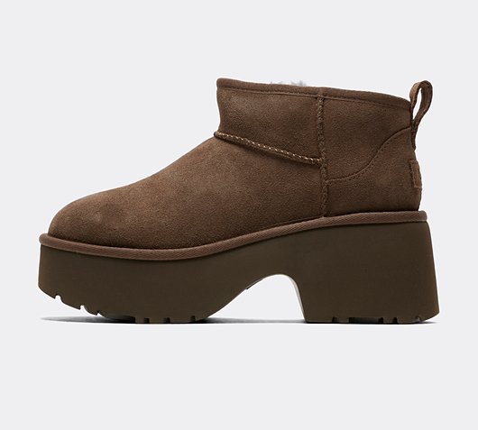UGG Womens Classic Ultra Mini New Heights Boots in Hickory. Reimagined with a bold new look in the New Heights Collection. Featuring the iconic UGG design with a modern twist, this boot comes with a platform profile, a trendy notch, and a 3 heel for added style. It's crafted with a suede upper, a rear pull tab, and a 17mm UGGplush lining and sockliner made from a blend of 60% upcycled wool and 40% TENCEL Lyocell for extra comfort. The foam footbed and Sugarcane EVA outsole provide cushioning, while the...