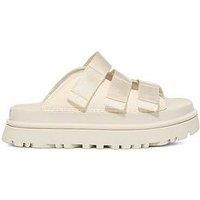 UGG W Goldenglow Slide - Jasmine Go ahead, let yourself shine. The GoldenGlow Slide is a versatile sandal with a sunny disposition. The outsole is made with super light and springy sugarcane EVA, its airy, easy, and bounces back. The upper features three adjustable straps, so you can create the perfect fit, whether youre rocking socks or not. Material Content: 52% Textile, 48% Synthetic