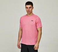 Under Armour UA Tech Textured Short Sleeved T-Shirt in Prime Pink and Black. UA Tech is the original must-have training gear from Under Armour's vast archives and is designed to keep you cool, dry and comfortable thanks to its super-soft polyester fabric and sweat-wicking properties that also dries really quickly. Short-sleeved with a rib crew neck collar, straight cut hem and Under Armour logo to left chest and to back of neck. Pink Size - S