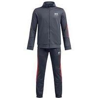 UNDER ARMOUR Junior Boys Icon Knit Tracksuit - Grey Size & Fit Available in sizes S - XL Details Junior Boys Icon Knit Tracksuit - Grey by UNDER ARMOUR Downpour Grey / Fire / White Smooth tricot knit exterior with a brushed interior for soft comfort & warmth Material wicks sweat & dries really fast Side stripe Open hand pockets JACKET: Long sleeves, funnel neck, zip fastening, ribbed cuffs & hem PANTS: Ribbed waistband with external drawcord Material & Care Material Content: BODY: 100% Polyester - Manufacturers part number: WF20K