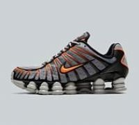 Nike Shox TL Trainers in Light Smoke Grey, Bright Mandarin and Black. Taking mechanical cushioning to unprecedented heights, level up in style thanks to this recrafted version of the 2003 legend. With a secure lace fastening and forged from breathable mesh in the upper, full length Nike Shox technology for superior impact absorption and a sensational bold aesthetic. With a full TPU cage, moulded overlays throughout the midfoot for optimal support, TPU plate in between the midsole and Shox tech, foam mid...