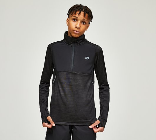 New Balance Junior Heat Grid Quarter Zip Top in Black. Overhead-style training top with a quarter zip fastening neck that can be worn up or down to control air flow and also ease of taking the garment off over layers. Long-sleeves complete with thumb loops that ensure a secure fit, and finished off with contrast NB logo to left chest. Regular fit. Black Size - S/B