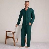 Unwind in style with this soft, jersey pyjama set designed for pure comfort. The top features a clean finish collar, a 5-button placket, chest pocket, and subtle piping for a refined look. Matching bottoms include a drawstring elastic waistband, faux fly, and handy side pockets for relaxed practicality. Crafted from a breathable cotton-rich blend with just a touch of stretch, these PJs move with you for a perfect night's sleep or laid-back lounging. | Lands' End Men's Knit Pyjama Set in Dark Green | ...