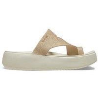 Crocs Getaway Platform Glitter Toe Loop Size & Fit True to size - order your usual size Standard fit Available in sizes 3 - 8 Details Getaway Platform Glitter Toe Loop by Crocs Beige Round toe Flat heel with a chunky sole Material & Care Material Content: 100% Thermoplastic (Glitter) - Manufacturers part number: Crocs_198445159183