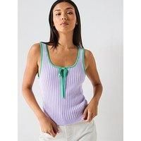 FREE PEOPLE All Star Sweater Tank Size & Fit Regular fit Available in sizes XS - XL Details All Star Sweater Tank by FREE PEOPLE Light Purple Sleeveless Scoop neckline with tie detail Contrast trim Ribbed fabric Material & Care Material Content: LDS KNIT MINIMAL COVERAGE TOP 91% VISCOSE 8% POLYAMIDE 1% ELASTANE Washing Instructions: Machine Washable