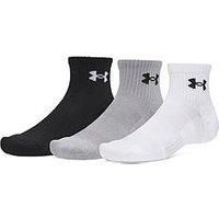 UNDER ARMOUR Mens Training Performance Cotton Quarter Socks 3 Pack Size & Fit True to size - order your usual size Crew length Available in sizes S: 13-4; M: 4-7.5; L: 7.5-12; XL: 12-15 Details Mens Training Performance Cotton Quarter Socks 3 Pack by UNDER ARMOUR White/Grey/Black Pack of 3 pairs Lightweight, soft cotton-blend fabric for all-day comfort Durable material wicks sweat and dries really fast Locked-in fit design keeps sock securely on heel for an adjustment-free fit Strategic mesh panels on t... - Manufacturers part numbers: WX85T|6009686