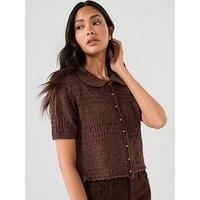 FREE PEOPLE Daylight Cardigan Size & Fit True to size - order your usual size Regular fit Cropped length Available in UK sizes: XS: 4-6; S: 8-10; M: 12-14; L: 16-18; XL: 20 Details Daylight Cardigan by FREE PEOPLE Brown Crochet fabric Short sleeves Collared neckline Button front fastening Rib-knit trims and raw-style lettuce hem Material & Care Material Content: LADIES KNIT CARDIGAN 62% COTTON 16% POLYESTER 14% VISCOSE 7% POLYESTER