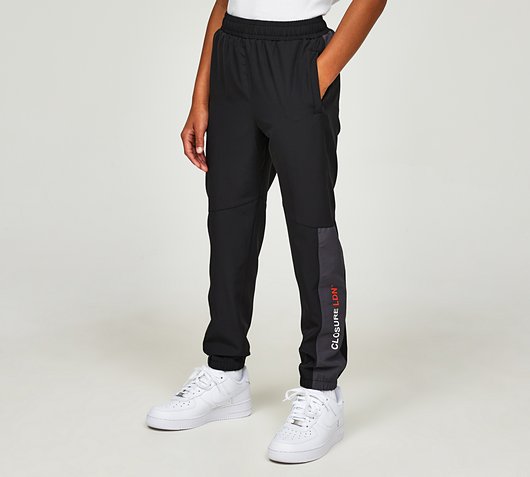 Closure London Junior Ripstop Tech Pants in Black. Forged from lightweight yet durable fabric for comfortable street-ready wear, these tech pants from Closure London come equipped with an elasticated adjustable drawstring waistband and elasticated cuffs for a great personalised feel. Handy side pockets and contrast panelling to lower left leg complete with Closure London branding overlaid. Regular fit. Black Size - M/B