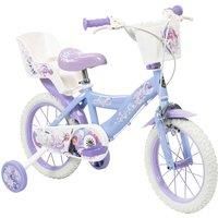 This freewheeling Disney Frozen licensed 14 inch bicycle comes with a front calliper brake and a rear drum brake.It features pneumatic tyres with spoked wheels with mudguards and also has removable stabilisers. The 14 inch Disney Frozen bicycle also comes with an adjustable saddle and handlebars and also comes with colourful Disney Frozen decals and a rear doll carrier with strap a front basket. Suits ages 4 - 6 years. Child height range 100 - 110 cm.. Disney Frozen licensed . With a front calliper brake and a rear drum brake . Features 14 inch pneumatic tyres on spoked wheels and removable stabilisers . Comes with a large front basket featuring all your favourite Disney Frozen characters and a rear doll carrier with strap . Suits ages 4 - 6 years. . Child height range 100 - 110 cm - Manufacturers part number: _