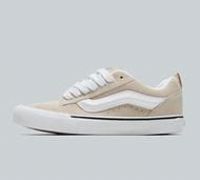 Vans Knu Skool Trainers in French Oak. A delightful re-issued model from the 1990s from back when the trend was for skate shoes to be extra puffy and proud. With a mix of deluxe suede and durable canvas teaming up on the upper, the low top silhouette boasts a large puffy tongue and ankle collar that provide a sensational exaggerated look that channels the spirit of the original Old Skool. Puffy 3D moulded Vans sidestripe, handy heel pulls and signature rubber waffle outsoles. Beige Size - 12