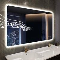 language Feel secure knowing our illuminated bathroom mirror is crafted from reinforced glass; offers exceptional durability and shatter resistance; designed to prevent dangerous shards from scattering in case of impact Elevate your bathroom experience with built-in Bluetooth speakers; provide rich, 360-degree sound; easily connect to your phone for seamless audio enjoyment No more dealing with foggy mirrors after a hot shower; activate the anti-fog feature with a simple button press; keeps your reflect...